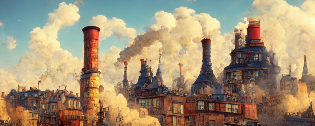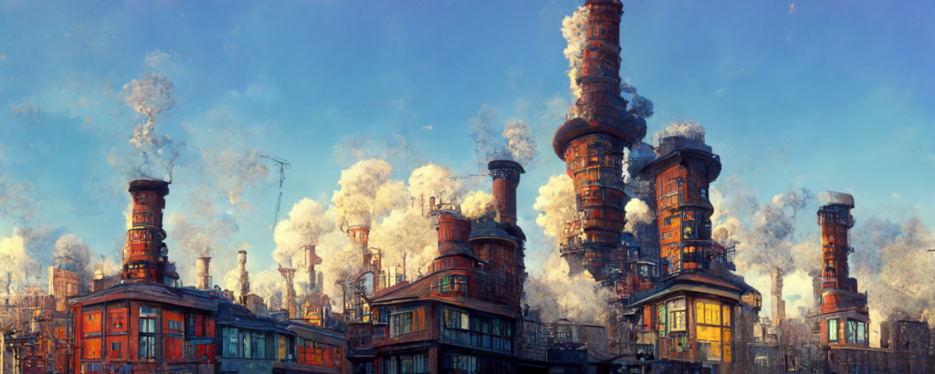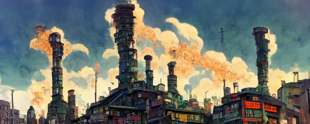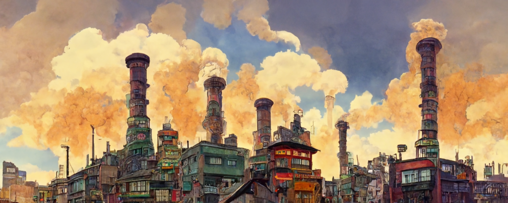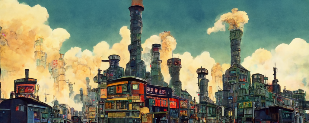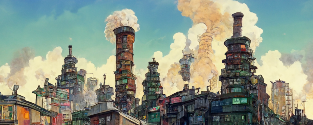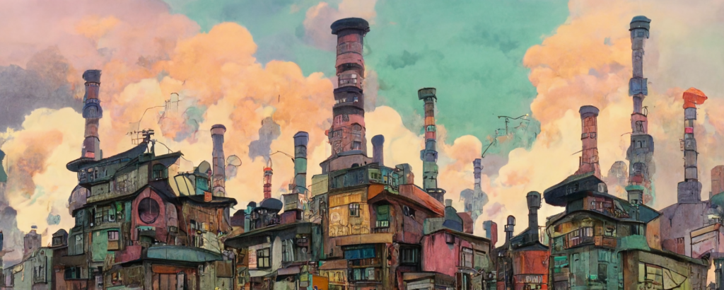 animation cel, simple paint, pastel color, steampunk, cyberpunk, shibuya, lot of chimneys, chimneytown, poupelle, ultra detailed, vivid, concept art, white steam, bright –ar 1500:500