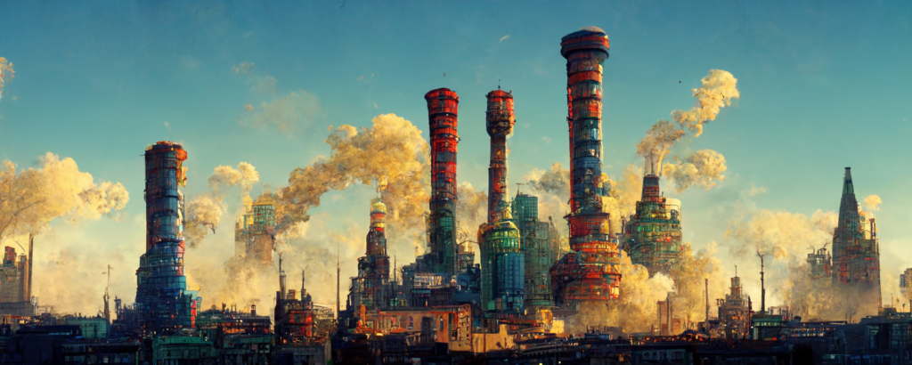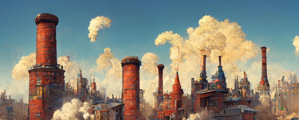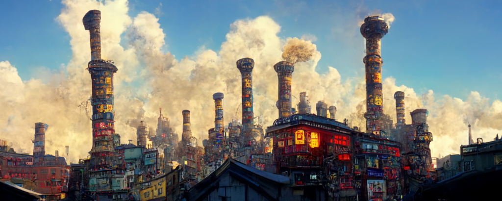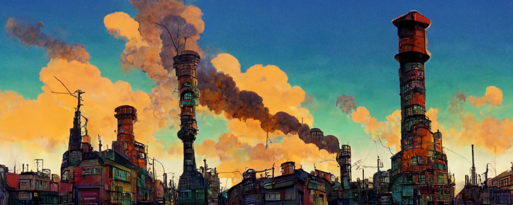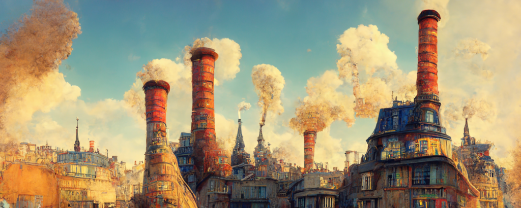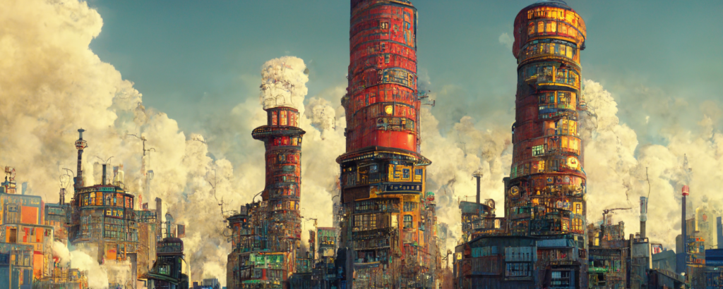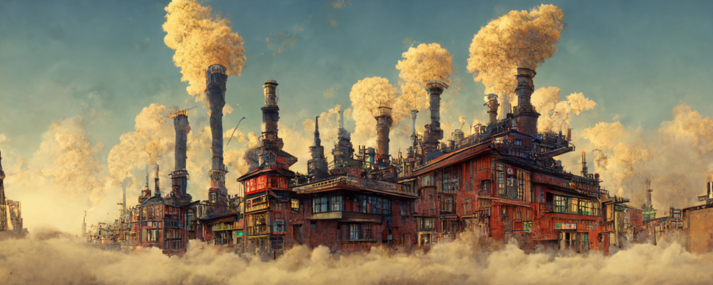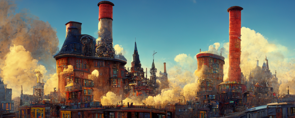 animation cel, simple paint, pastel color, steampunk, cyberpunk, shibuya, lot of chimneys, chimneytown, poupelle, ultra detailed, vivid, concept art, white steam, bright –ar 1500:500